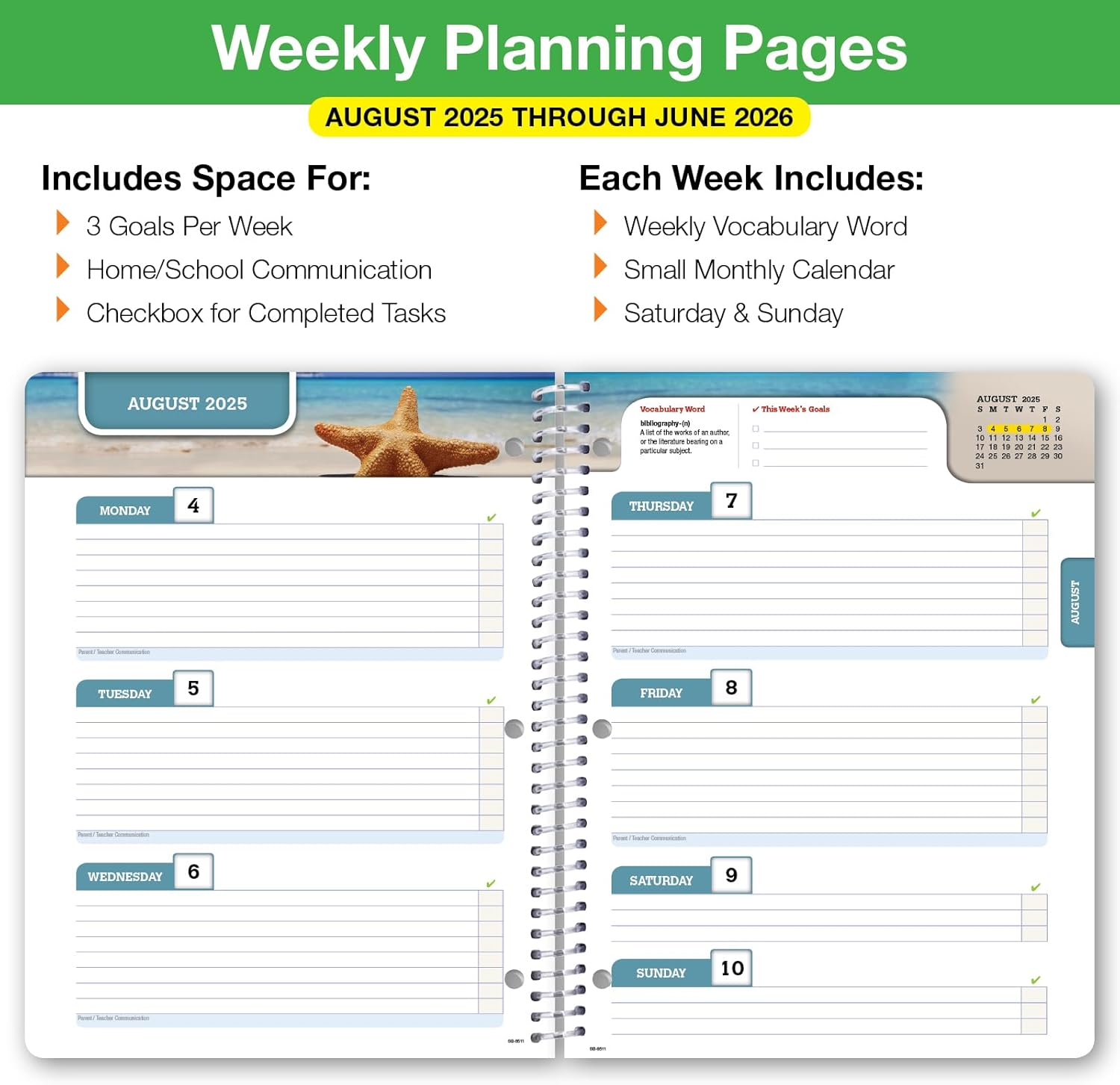 • 8.5″ x 11″ Dated Student Agenda & Academic Planner for Middle or High School students. Planner runs from August 2025 through June 2026